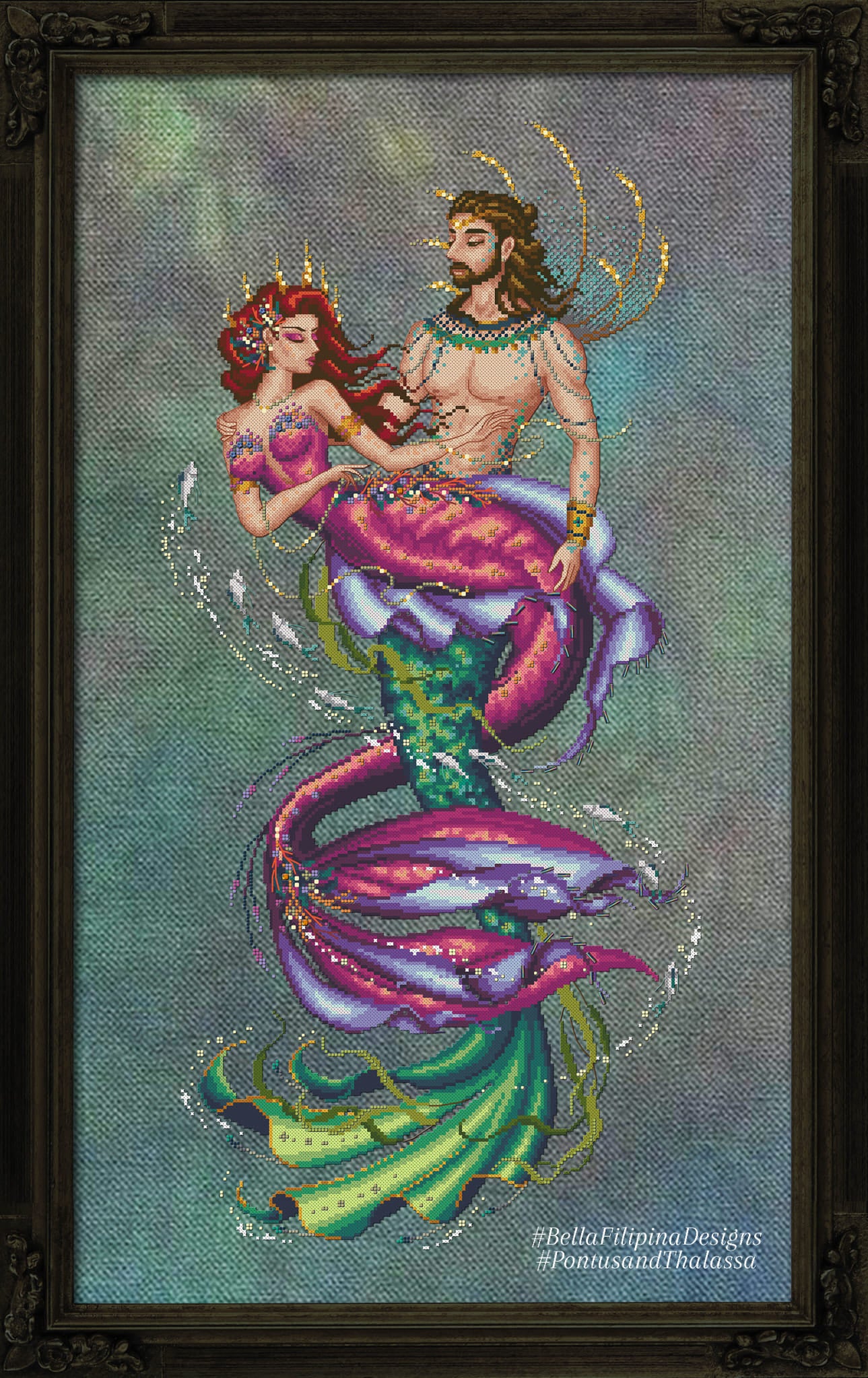 At the beginning of time, primordial gods existed. The vast uncharted ocean was then personified by Pontus, and marine life was made by Thalassa. Both protogenos of the sea, they created a magnificent underwater world, filled with treasures and wonder, beyond human have ever discovered. Truly, their love as vast as the ocean. Their romance is as old as time." This cross stitch design from Bella Filpina features a mermaid and a merman!
